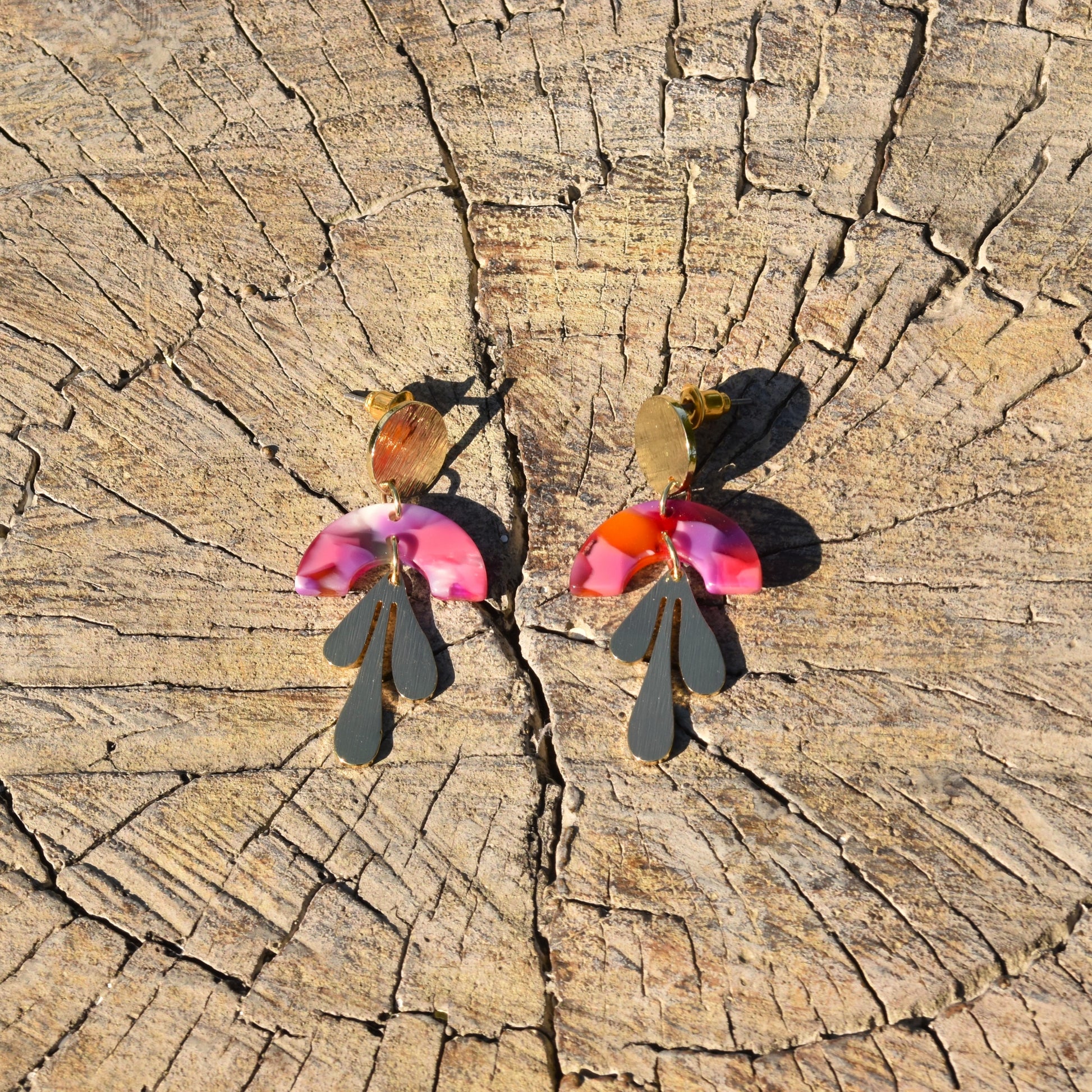 Pair of hanging droplet tiered earrings consisting of translucent vibrant fuchsia colours, including, lilac, purples, pinks, white and red. Made from sustainable resin recycled from surplus spectacle frame materials, each pair features a unique mix of vibrant marbleised patterns, no two earrings alike.