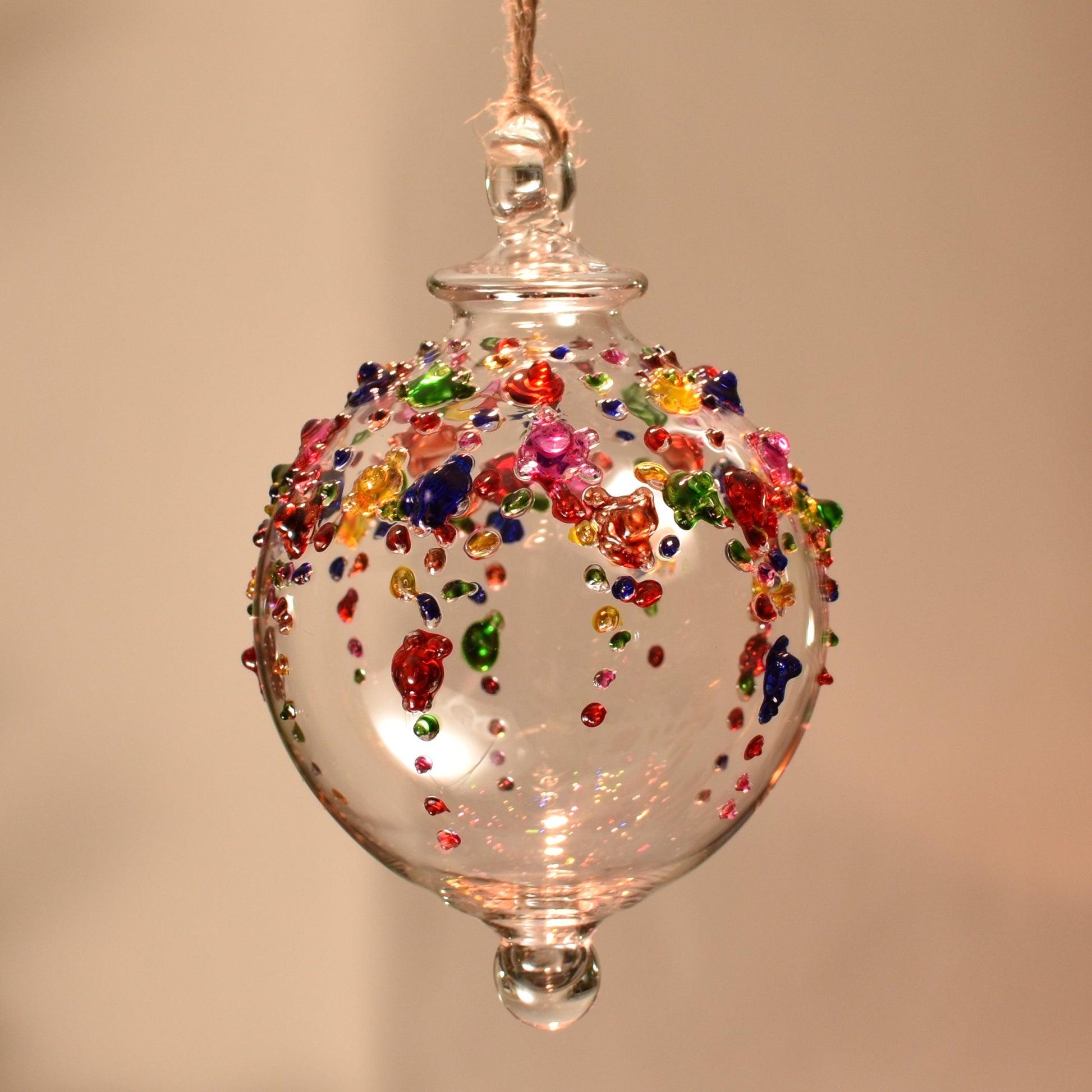 Fun, get still classy. This glass bauble is dripping with hand painted glass gems, in lots of festive colours. The clear glass allows the lights on your tree to shine through, making the 'gems' sparkle.