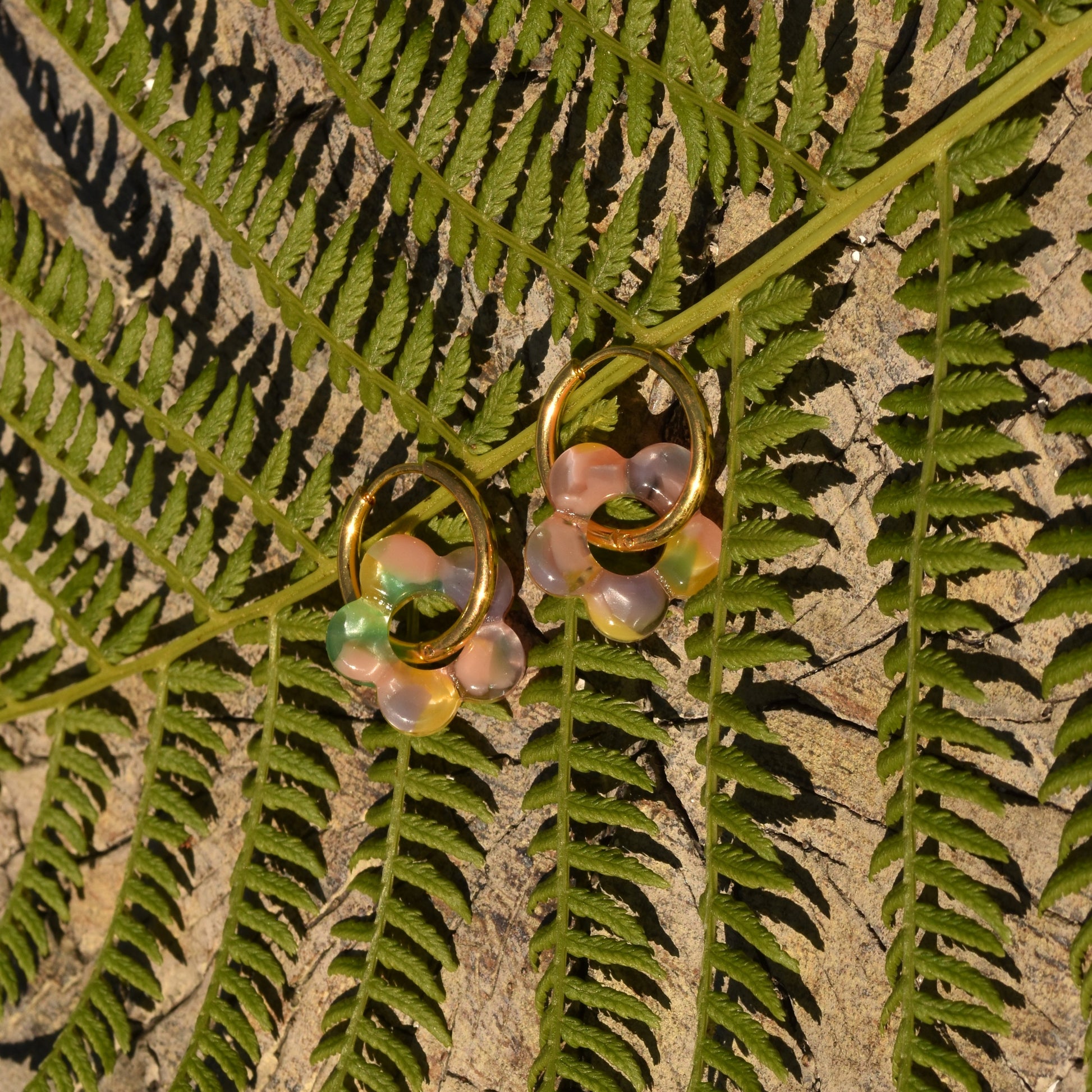 This pair of pretty flower and hoop design earrings, consist of translucent mix of soft pastels, featuring pinks, lilacs, yellows and greens.