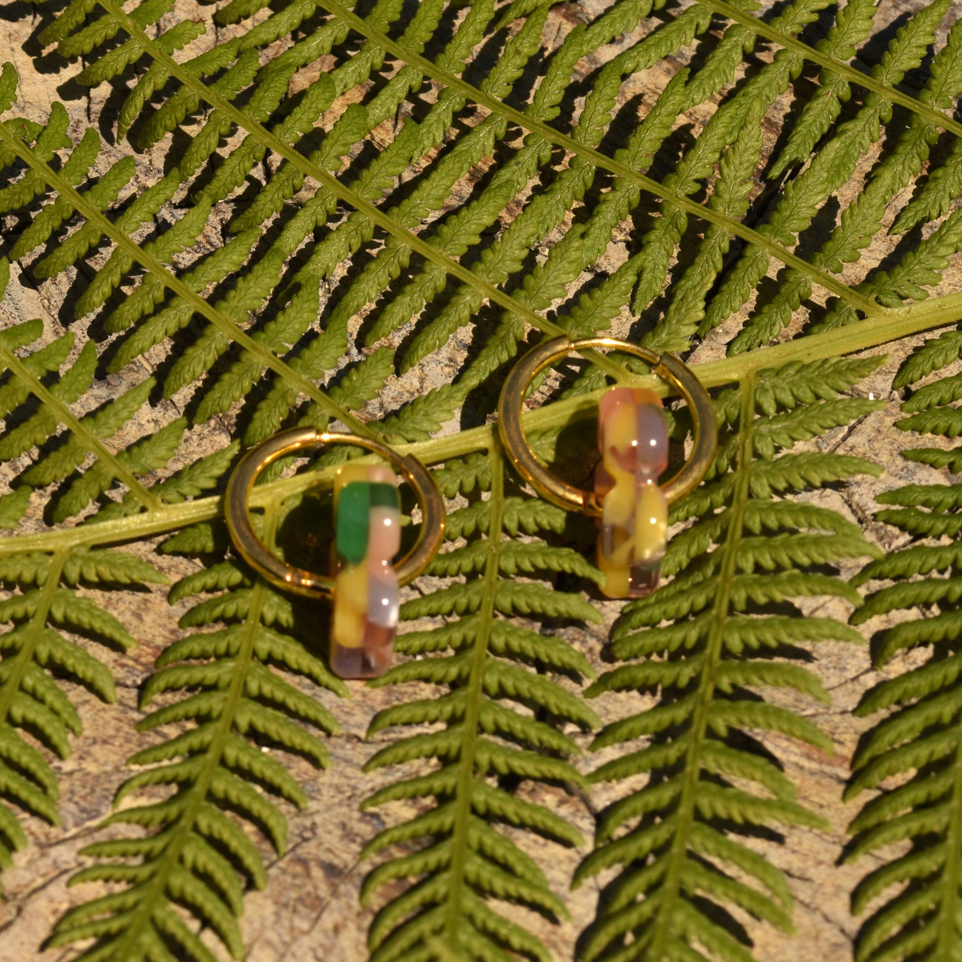 Made from sustainable resin, recycled from surplus glasses frame material; each pair features a unique mix of vibrant marbleised patterns, no two earrings alike.