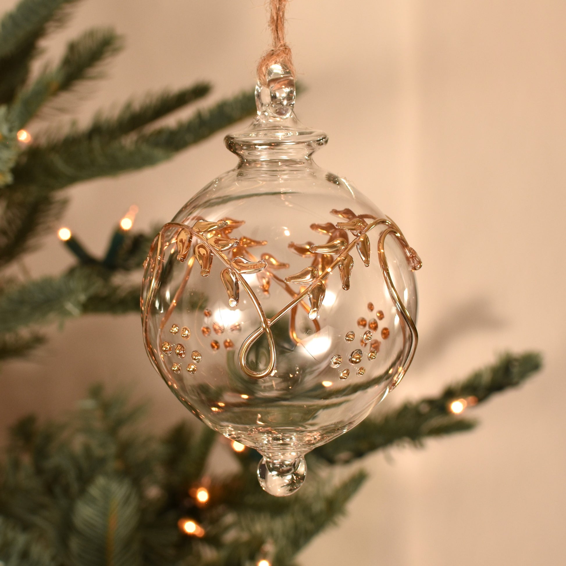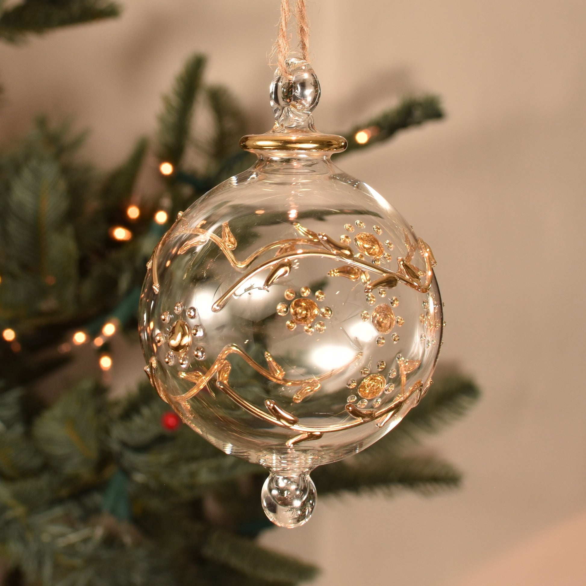 Hand-blown glass tree decoration, with beautiful swirling vines around love hearts, highlighted by hand in luxurious gold.