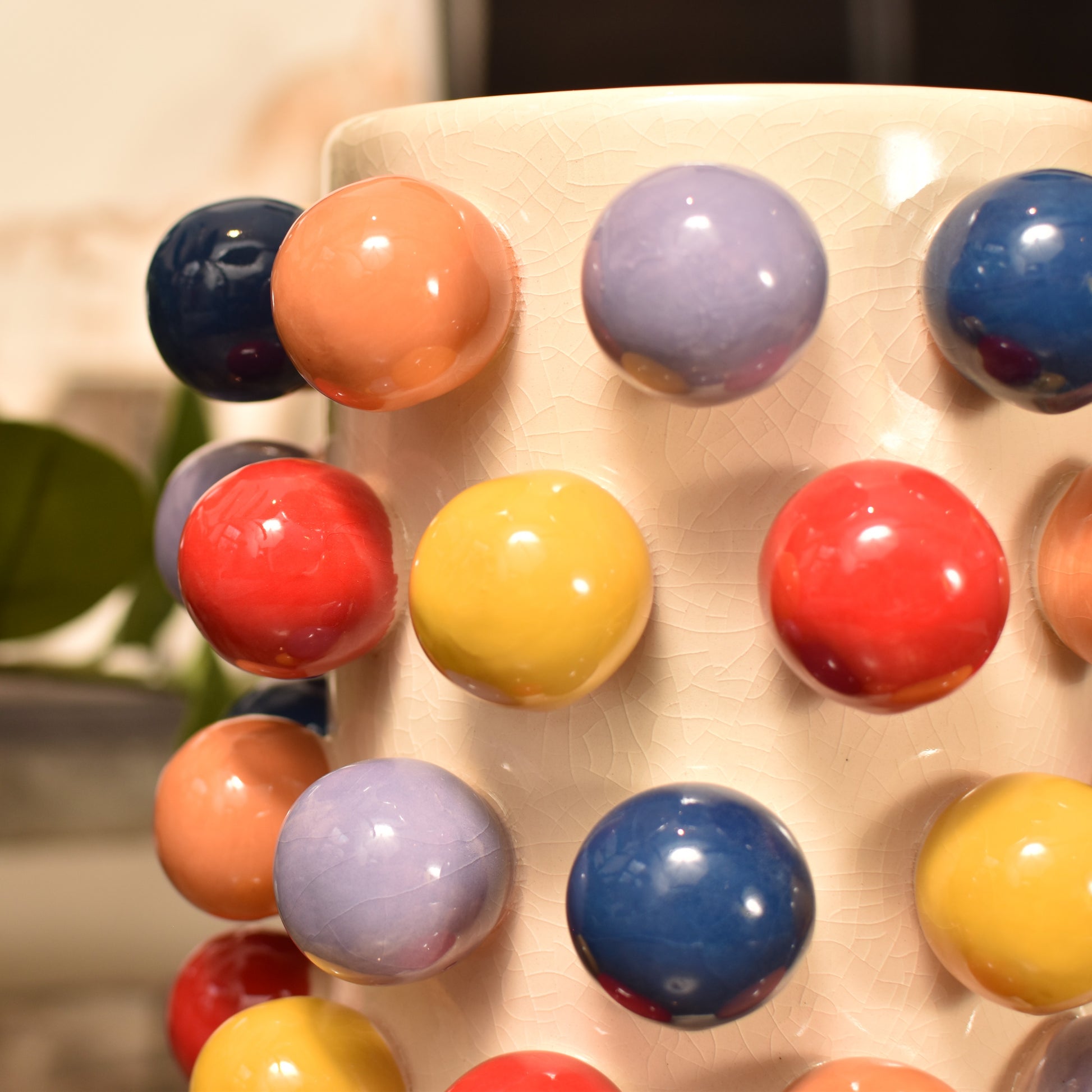 The soft cream ceramic body features a distinctive crackle glaze that adds depth and texture, whilst vibrant multi-coloured ceramic balls are fixed to the exterior surface, creating visual interest from every angle.
