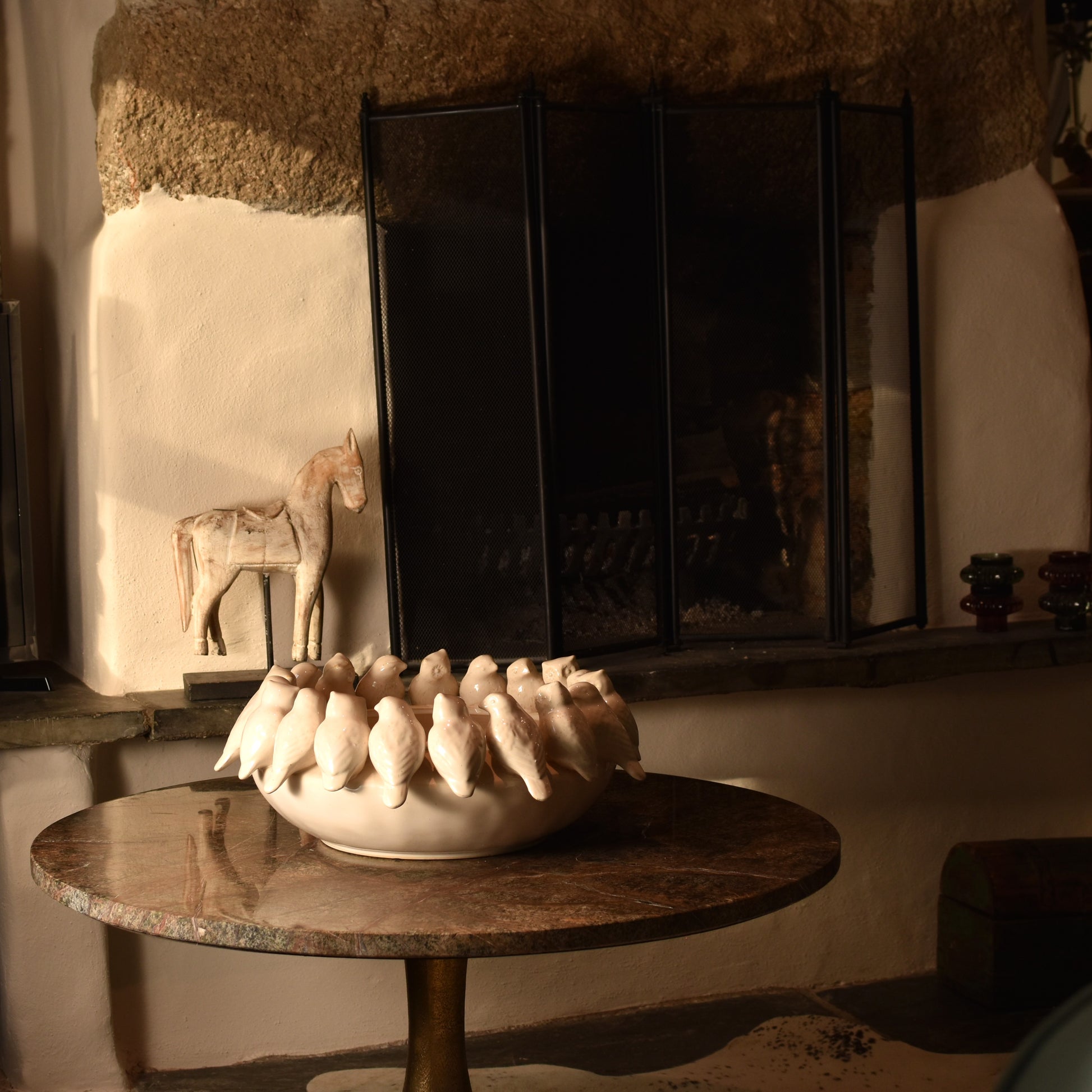 The mottled cream finish provides a sophisticated, understated backdrop that allows the sculptural details to command attention. Ideal for either display or functional use.