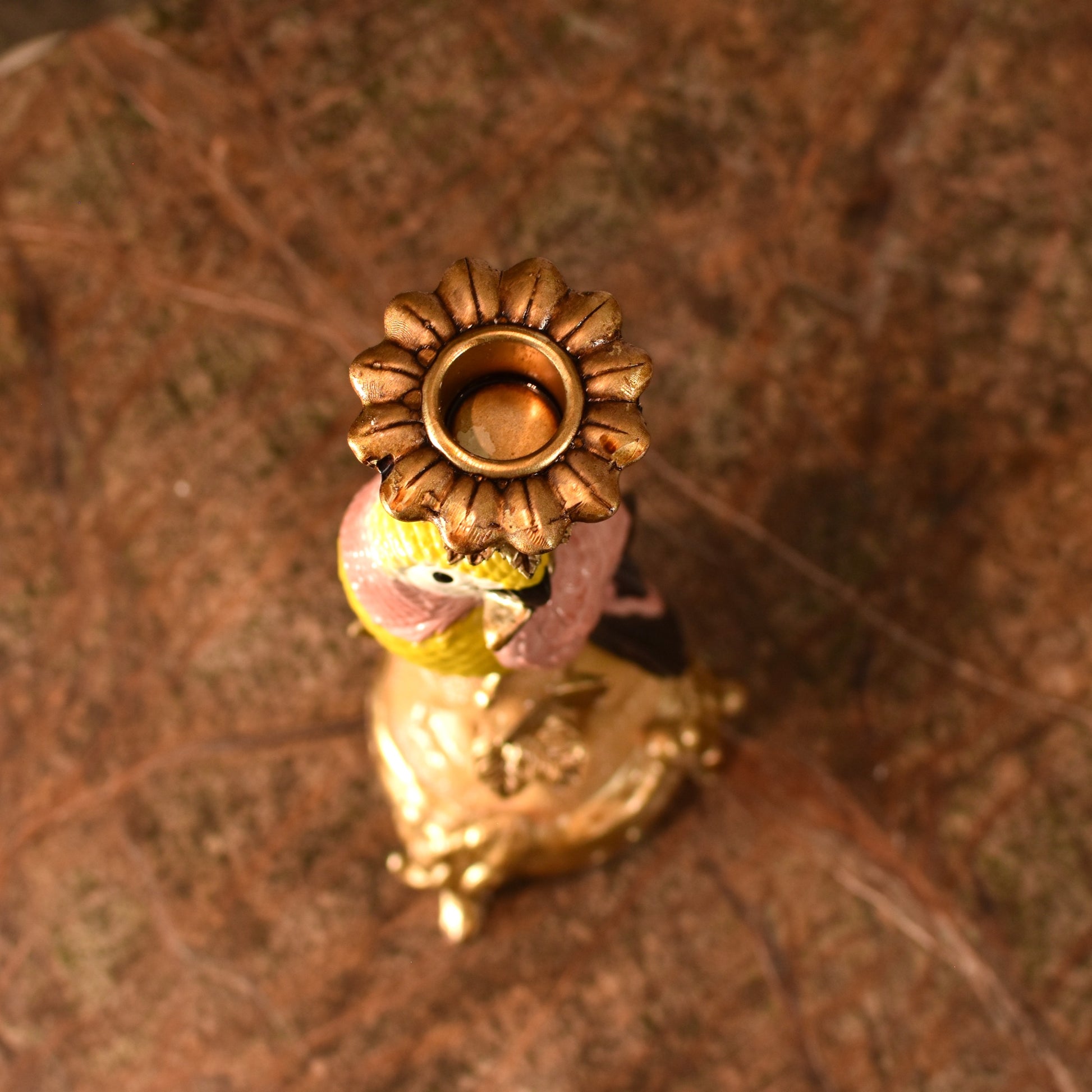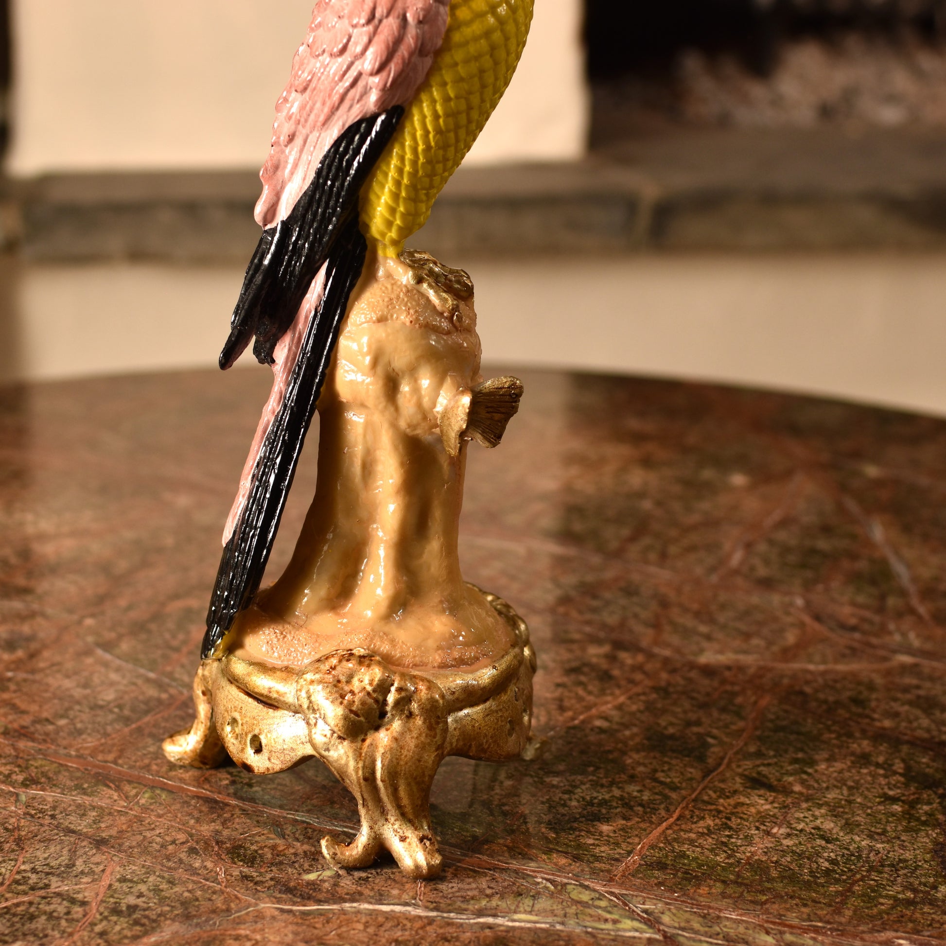 This elaborate candlestick features a hand-painted parrot in beautiful pink and yellow hues, crafted in resin with a lot of decorative detailing. The ornate design captures the bird's distinctive character, making it an elegant accent piece for any interior.