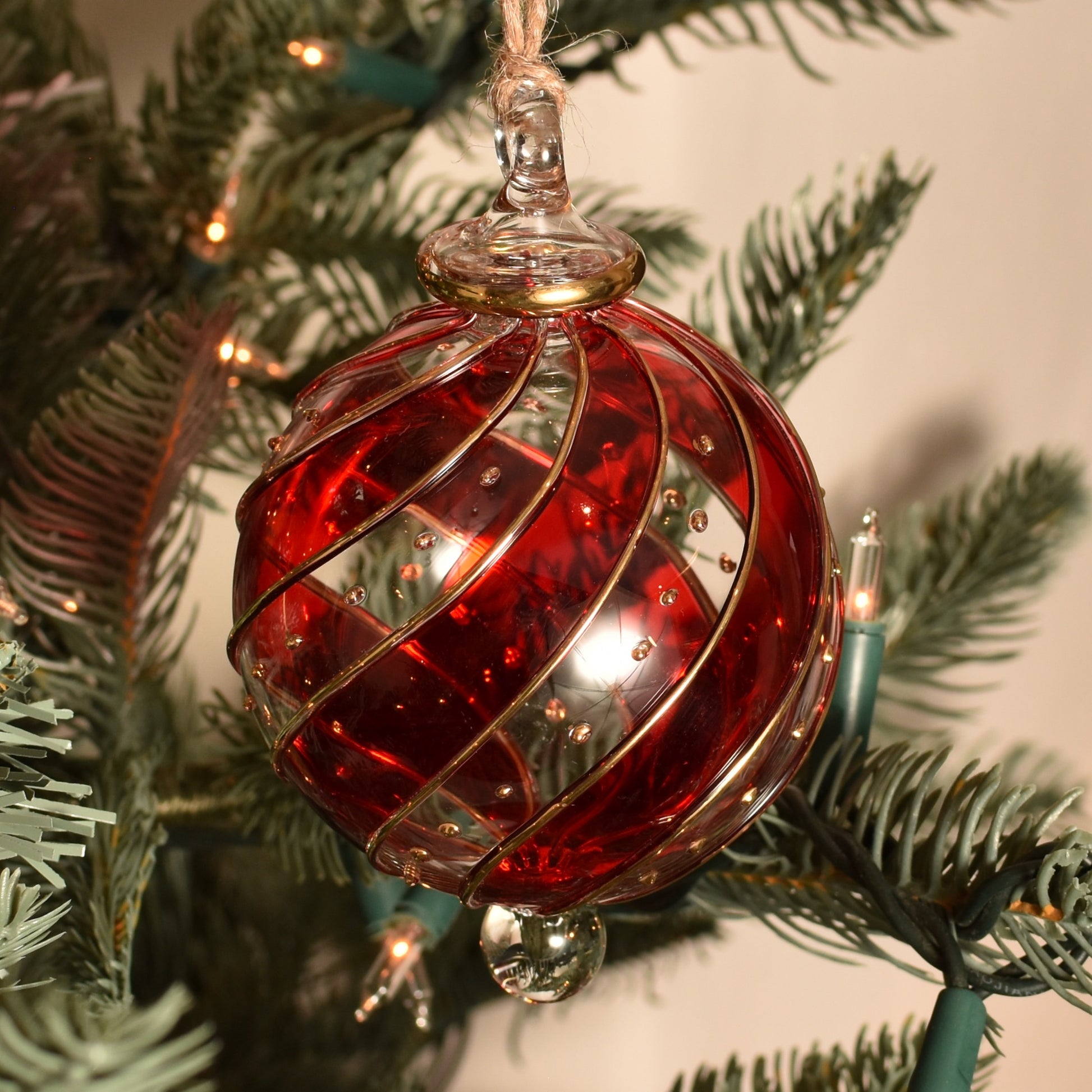 Handblown bauble with ribbons of red from top to bottom, hand painted in festive red, with gold highlights.
