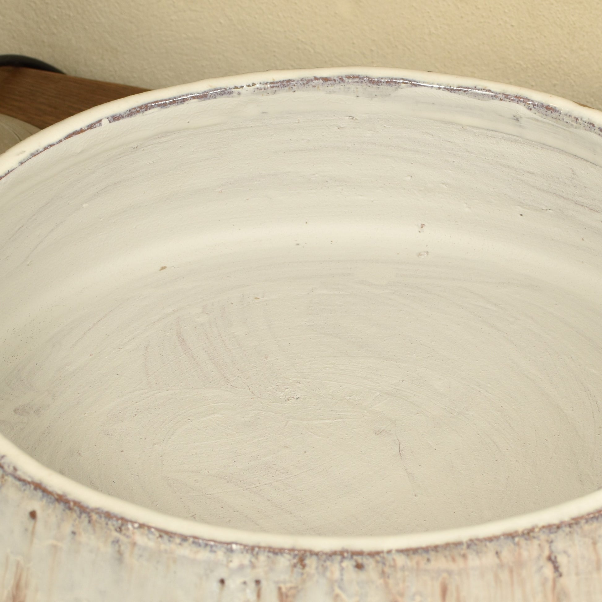 A shallow, rustic bowl with a partially reactive glaze on the exterior and a matte white-wash finish inside.