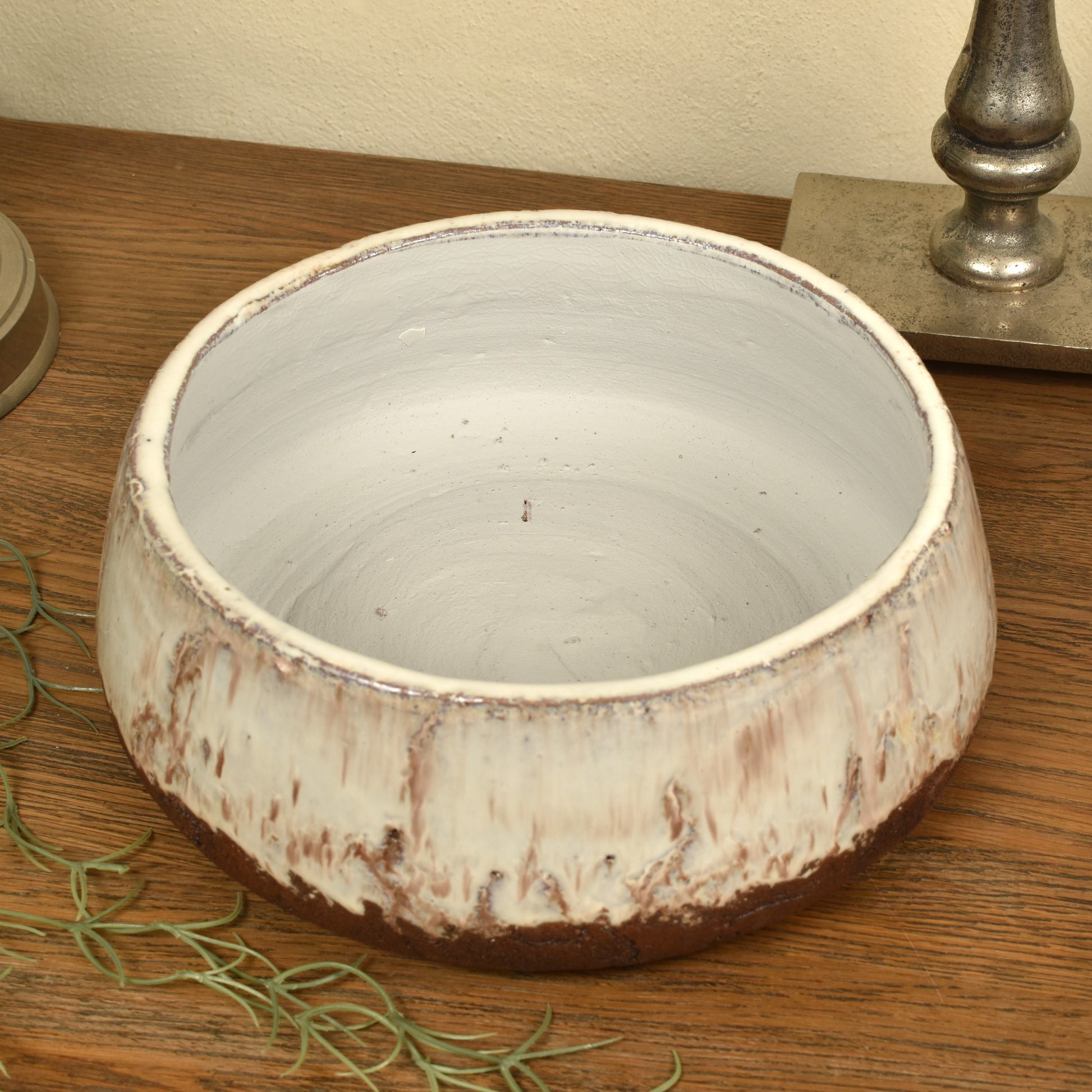 A shallow rustic bowl, featuring a part reactive glaze on the outer side and a matt white-wash on the interior.
