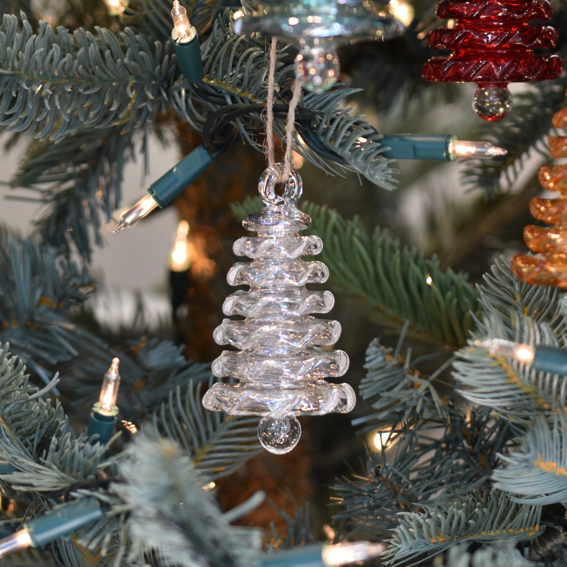 Hand-blown miniature tree decoration with detailing, crimped by hand and dipped for a slightly iridescent clear glass.