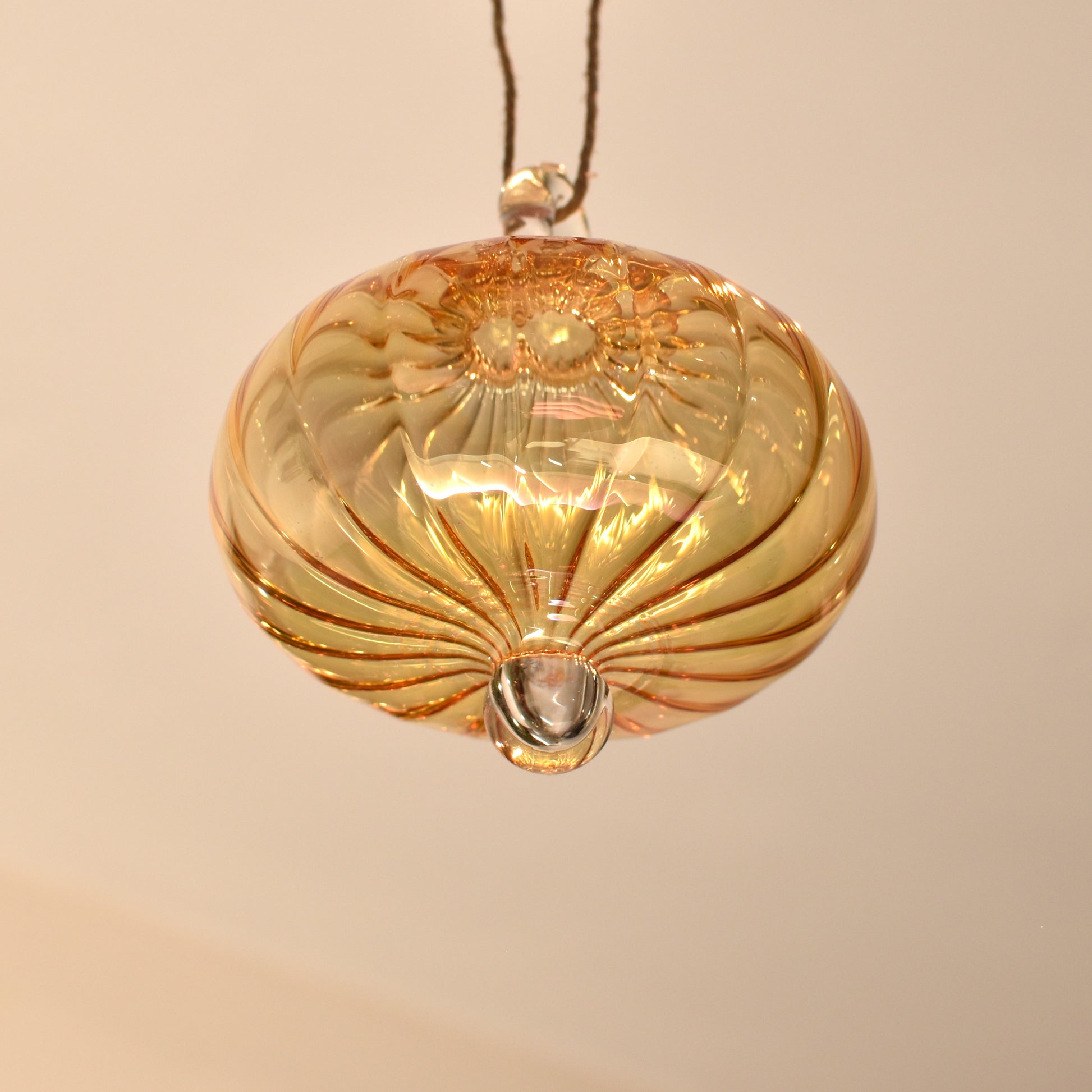 Hand-blown glass tree decoration with beautiful ribbed design to catch the light. Dipped in a stunning slightly iridescent amber glaze.